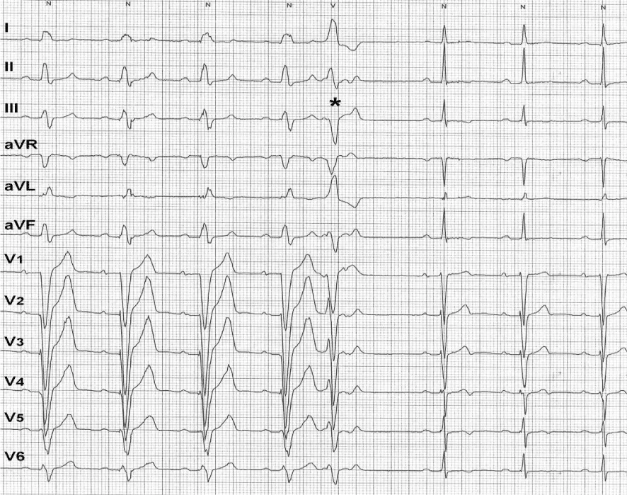 Figure 1:12-lead ECG showing intermittent LBBB. Aberrant conduction disappeared following a premature ventricular complex (the asterisk). Please see text for discussion.