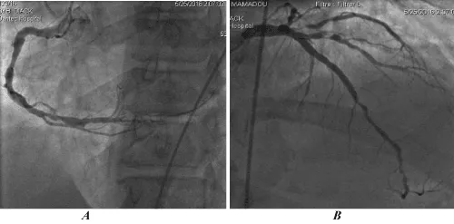 At the angiographic level, the indications, the approach, the duration of the procedure, the dosimetry and the results had been specified. Elemental lesions, whether angiographically significant or not, were studied and evaluated according to the TIMI flow. We had investigated the affections of the common trunk, the mono, bi and tri truncular lesions. The incidents and accidents encountered during the proceedings had also been reported. The number of patients who had undergone angioplasty was specified, as was the technique used (direct stenting, pre-stent dilation plus stent, thrombo-aspiration), the type of stent used, the nature of the TIMI flow after angioplasty. All patients undergoing a percutaneous coronary intervention (PCI) were pretreated with a 600 mg dose of clopidogrel and 250 mg IV dose of aspirin. Patients with an indication of surgical revascularization or medical treatment alone were also sought.