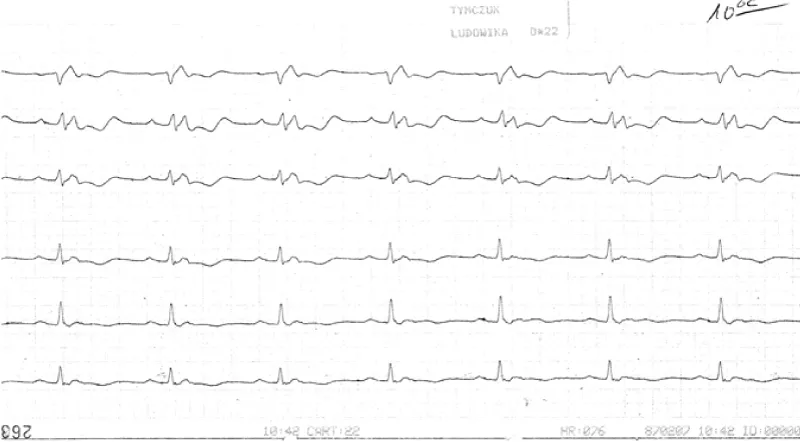Founder mutations are rare causes in arrhythmogenic cardiomyopathy including TMEM43 und phospholamban mutations. The incidence is approximately 1%. P.S358L TMEM43 mutations cause aggressive, in most cases biventricular arrhythmogenic cardiomyopathy [1], with the necessity of primary prophylactic ICD implantation in men and in women>30 years for sudden cardiac death prevention. The mutation increases the stiffness of the cell nucleus thus producing the massive loss of cardiomyocytes [2]. P.Arg14del phospholamban mutations cause biventricular arrhythmogenic cardiomyopathy with predominant heart failure, and in some cases, secondary sudden cardiac death [3]. Both founder mutations have characteristic electrocardiographic appearance, together with typical ECG manifestations of arrhythmogenic cardiomyopathy like right precordial T-wave inversions, terminal activation delay and epsilon waves in right precordial leads. Typical ECG manifestations in TMEM43 mutations are poor R-wave progression in right precordial leads (Figure 1), often associated with T-wave inversions in lateral leads [4]. Typical ECG manifestations in phospholamban mutations are low voltage ECG [5], more than complete right bundle branch block [6], epsilon waves in right precordial leads and in lead aVR [7] and right precordial T-wave inversions (Figure 2). Atrial fibrillation occurs frequently.