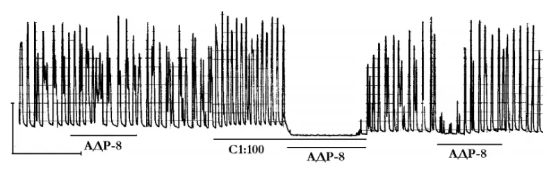 Figure 1: Mechanogram of longitudinal strips of nonpregnant uterine horn rats showing β- adrenosensitizing effect of 100-fold dilution of venous blood serum (C1: 100) of the pregnant woman. The horizontal lines under the mechanogram represent the time exposure of the serum (С:100) and adrenaline (8×10–8 g/ml; AДР-8). Calibration — 10 mN, 10 min. From [10]. Адр-8 — adrenalin, 10–8 g /Мl; С1:100 — serum of venous blood in dilution 1:100.