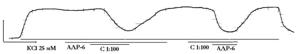 Figure 2: Mechanogram of circular strip of porcine coronary artery showing β- adrenosensibilizatotory activity of 100-fold dilution of umbilical cord blood serum (С 1:100) on the background of tone, induced by hyperpotassium (25 мМ KCl) Krebs solution. The horizontal lines under the mechanogram represent the time of exposure to substances, including hyperpotassium Krebs solution (25 mM KCl), adrenaline (10 -6 – g/ml, ADR-6) and the blood serum (С1:100). Calibration — 10 mN, 10 min From [9]. 25 мМ KCl — hyperpotassium (25 мМ KCl) Krebs.