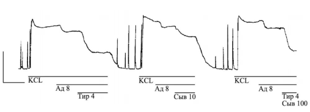 Figure 3: Mechanogram of longitudinal strip of nonpregnant rat uterine horn showing of β- adrenosensitizing effect of tyrosine, 10–4 g/ mL (tyrosine 4), 100-fold dilution of serum (serum 100), including at their combined effect on KCl-induced contracture. Horizontal lines indicate the time of exposure to substances, including adrenaline (10–8 g / ml; Ад 8. Calibration — 10 mN, 10 min. From [20]. KCl - hyperpotassium (25 мМ KCl) Krebs solution; Ад 8 — аdrenaline, 10–8 g/mL Тир 4 — tyrosine,10–4 g / mL; Сыв 100 — serum of venous blood in dilution 1:100.
