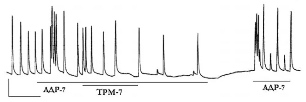 Figure 4: Mechanogram of myometrium strip of pregnant woman showing β- adrenosensitizing effect of trimetazidine. Horizontal lines under the mechanogram reflect the time of exposure to substances, including trimetazidine, 10–7 g / ml (TPM-7) and adrenaline, 10–7 g/ mL (АДР-7). Calibration — 10 mN, 10 min. From [38]. АДР-7 — adrenaline, 10–7 g/mL TPM-7 — trimetazidine, 10–7 g / ml.