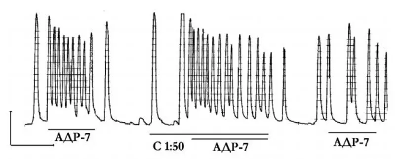 Figure 5: Mechanogram of myometrium strip of pregnant woman showing β- adrenosensitizing effect of 50-fold dilution of blood serum of pregnant women (С 1:50) but not at the time of perfusion and after it. Horizontal liness under the mechanogram reflect the time of exposure to substances, including adrenaline, 10-7 g/mL (АДР-7) and blood serum in dilution 1:50 (С 1:50). Calibration — 10 mN, 10 min. From [11].