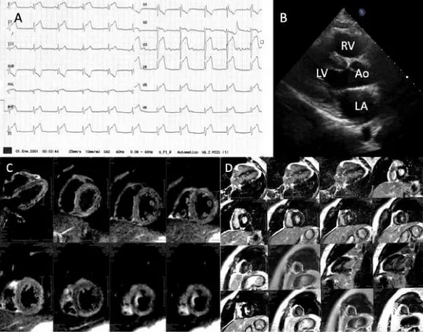 Figure 1:Acute viral myocarditis. A: Emergency department ECG that showed sinus rhythm and ST segment elevation of 0.5 mV in all leads. B: Transthoracic echocardiogram with normal diameters and systolic wall thickness. C,D: Cardiac magnetic resonance with late gadolinium enhancement in the left ventricular infero-lateral and inferior walls, suggestive of myocarditis.