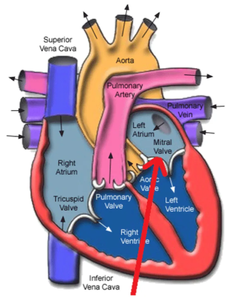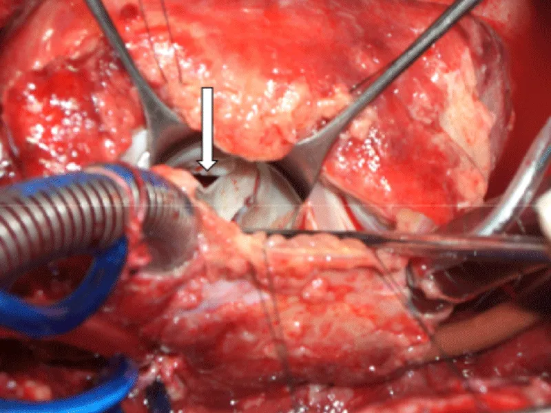 Figure 2: Perforation of the body of the anterrior mitral valve (white arrow).