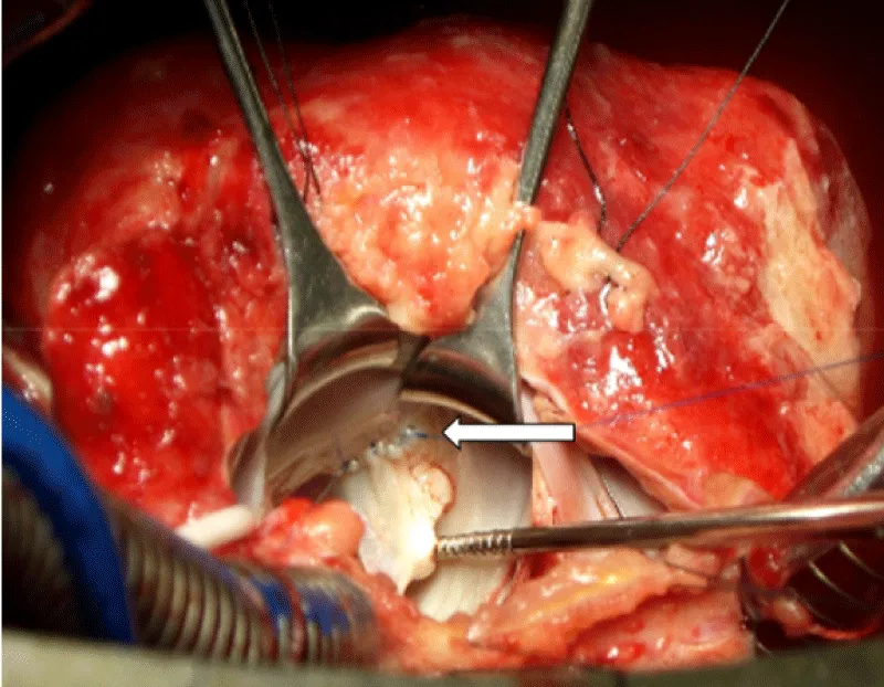 Figure 3: Continious suture of the tear of large mitral valve using 6-0 prolene (white arrow).