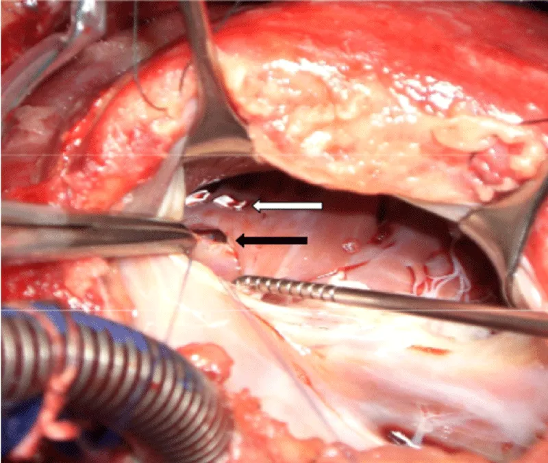 Figure 4: Closure of the VSD (black arrow) by two interrurpted pledgeted prolene sutures (white arrow).