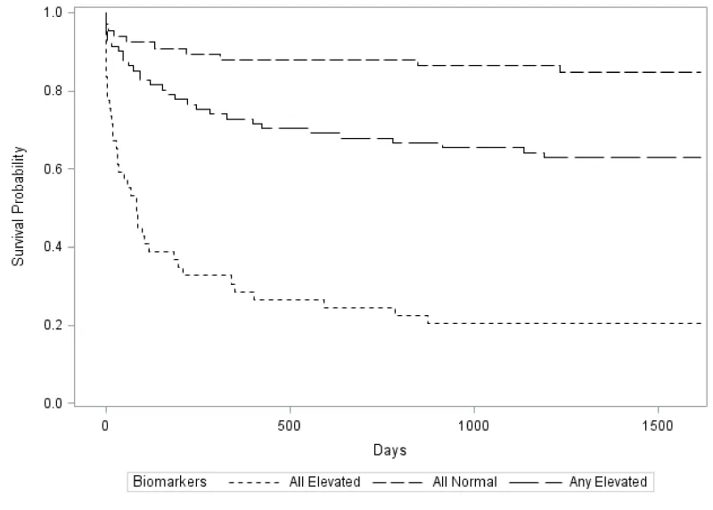 Figure 2: Kaplan-Meier survival curves based on combined risk stratification for NTproBNP, cTnI, and IL-6 using dichotimized median cutoff points. Patients with elevated levels of all three biomarkers had significantly higher risk of adverse events compared to those with any one of the biomarkers elevated and those with biomarker concentrations below the median cutoff.