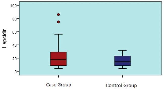 In the case and control group, hepcidin value was not significantly different (p > 0.05) (Table 1, Graphic 1).