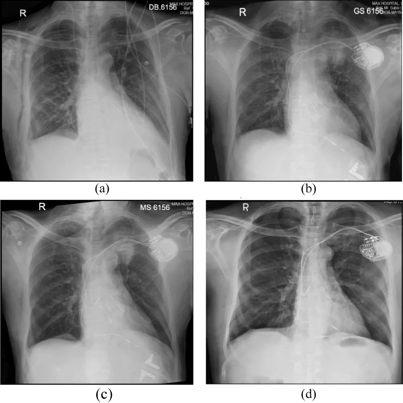 Figure 1: (a) Pre procedure chest x-ray, (b) Immediate post procedure x-ray showing alveolar haemorrhage, (c) post procedure x-ray after one day showing clearance of lung parenchyma; (d)post procedure x-ray after 72 hours showing almost complete normalization.