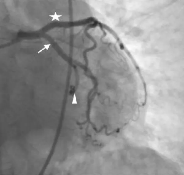 Figure 2: Percutaneous coronary angiography shows the anatomy of the coronary arteries. The star refers to the left anterior descending artery, the arrow refers to the left circumflex coronary artery, and the arrow head refers to the abnormal branch of the LCX that is now embolized using 3 coils.