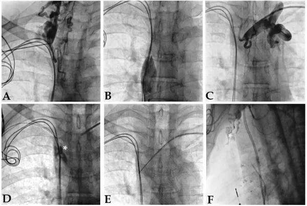 Figure 1: Complete SVC occlusion (A-C). Recanalization failed despite attempted balloon dilation (D), transseptal needle puncture via femoral route, and transseptal needle puncture via left subclavian route (E) – which created a contained perforation (F).