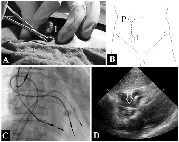 Figure 2: (A) Dissection upto fascial plane before needle puncture. (B) Schematic showing site of incision - I, subcutaneous route of lead, and pacemaker pocket - P. Fluoroscopic (C) and echocardiographic (D) appearance of atrial alpha-loop to reduce risk of dislodgement.