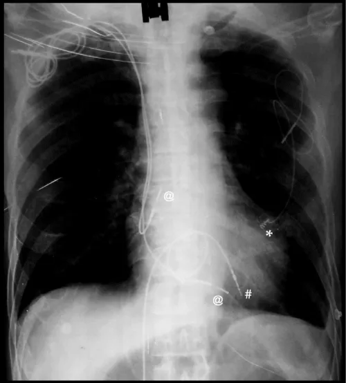 Figure 3: (Final position of pacemaker, new transiliac ventricular lead (#), old subclavian atrial (@) & ventricular leads (@), and epicardial lead (*) on thoracic-abdominal radiograph.