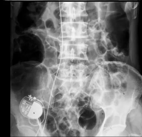 Figure 4: Abdomino-thoracic radiograph showing final position of old leads and new implant.