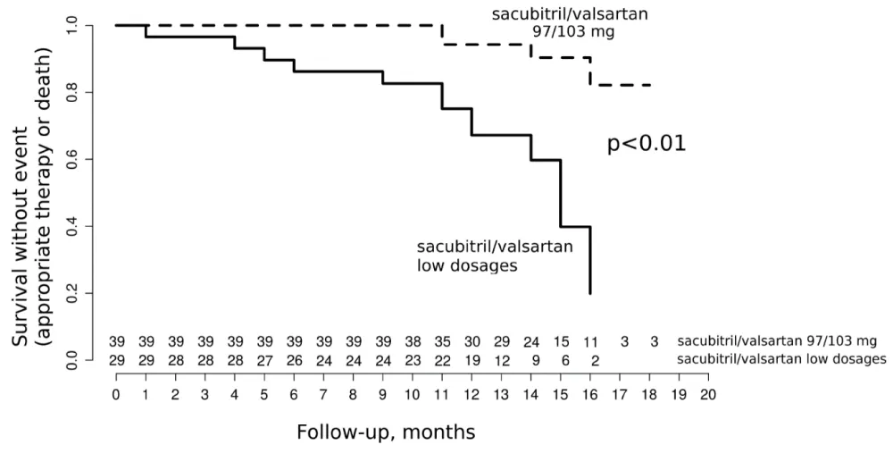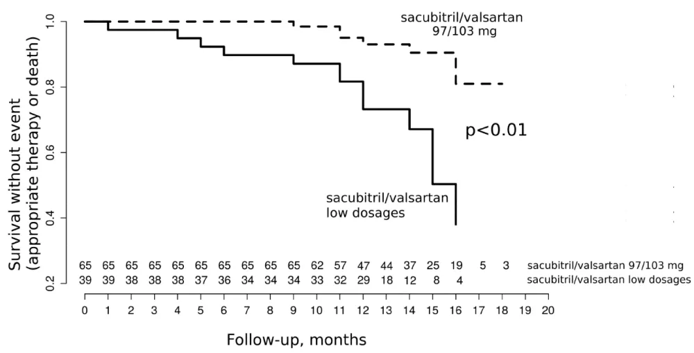 Conclusion: Patients with HFrEF under the highest dose of sacubitril/valsartan showed better clinical outcomes with a decrease of both mortality or appropriated ICD therapies related to ventricular arrhythmias.