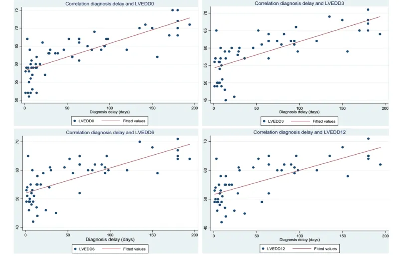 Graph 1 analyze correlation between LVEDD, measured at admission, at three, six and twelve months and the diagnosis timelines. Graph 2 analyze correlation between LVEF, measured at admission, at three, six and twelve months and the diagnosis delay.