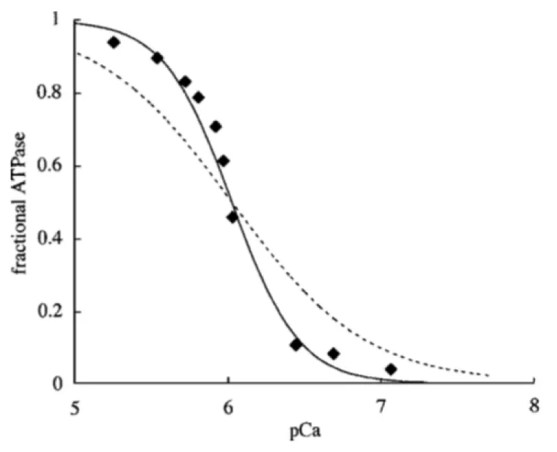 The displacement is to the left, lower [Ca2+] approaching the Km for cTnC Ca2+ binding (Table 2). The Ca2+ cooperativity is lost, lower Hill coeficient (nH), CaATP bound is not required. This demonstrates that MgATP can act as substrate when cMyBP-C is not bound to myosin-actin.