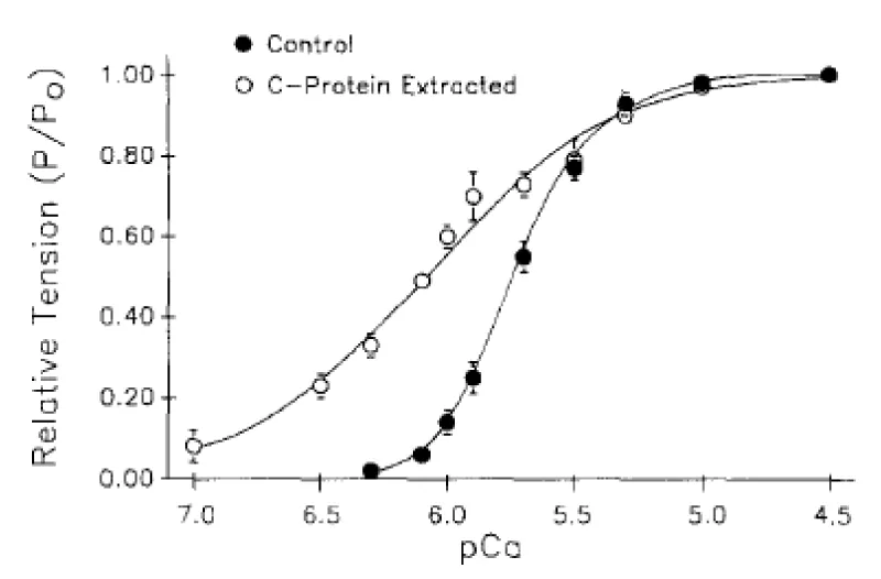 - Hofmann PA, Hartzell HC, Moss RL. Alterations in Ca2+ sensitive tension due to partial extraction of C-protein from rat skinned cardiac myocytes and rabbit skeletal muscle fibers. J Gen Physiol. 1991; 97: 1141–1163. PubMed: https://www.ncbi.nlm.nih.gov/pubmed/1678777