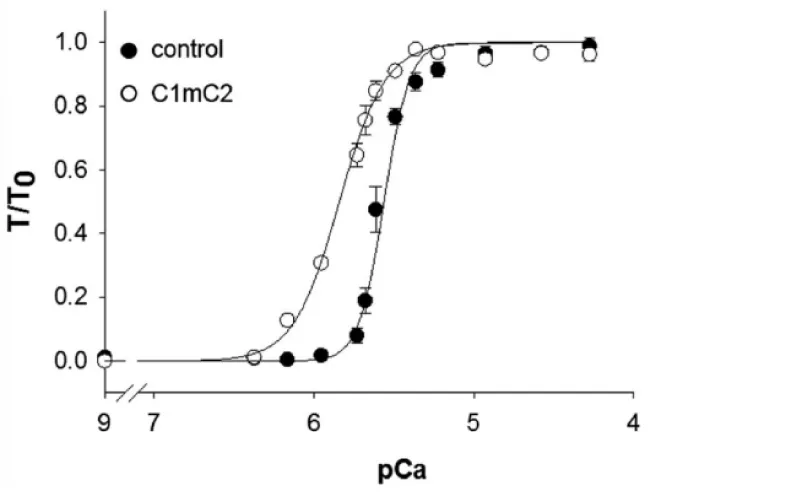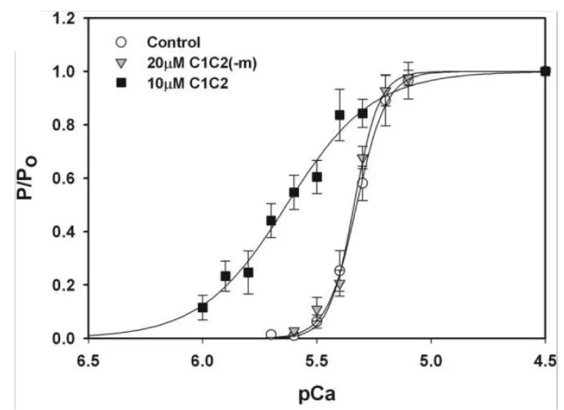 Incubation of trabeculae with 10 μM C1C2 resulted in a leftward shift of the tension–pCa relationship relative to control, indicating an increase in Ca2+ sensitivity of tension (ΔpCa50 = 0.30 ± 0.05). This confirms the incorrectness of the observation of Harris, et al. [14] (Table 3).