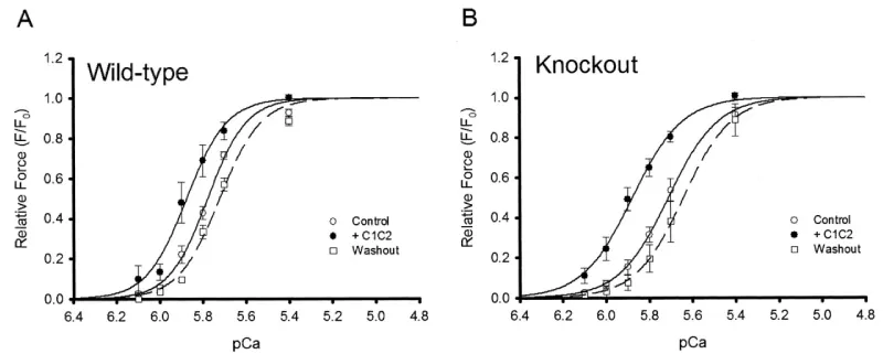 Figure 10: Effect of C1C2 peptide (10 µM) on tension-pCa relationships in permeabilized myocytes, Wild type and cMyBP-C-nul knockout, from Harris, et al. [14].