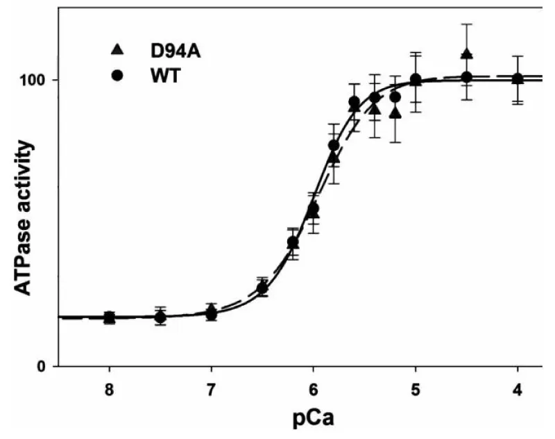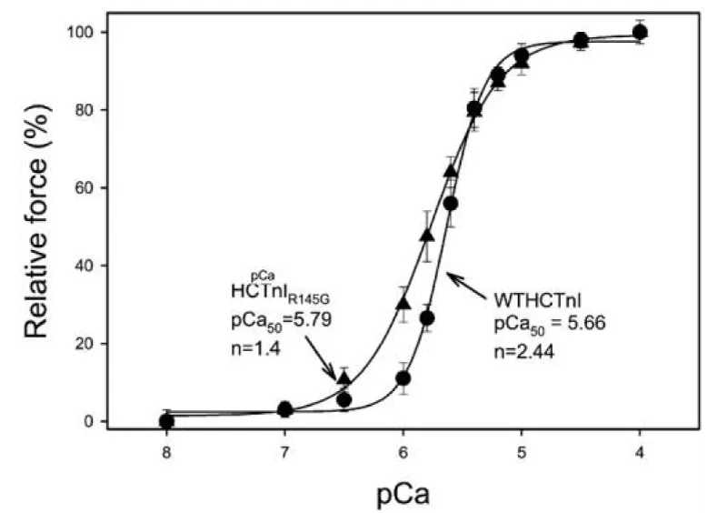 Figure 15: Activation of actin-Tm-activated myosin ATPase activity by either WTHCTnI or HCTnIR145G, dependence on Ca2+, from Lang, et al. [19].