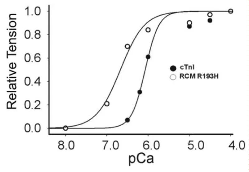 There are reports of restrictive cardiomyopathy (RCM) showing major loss of Ca2+ cooperativity arising from mutations mostly in cTnI. RCM is a more pronounced form of HCM. Two examples are given here, both from Davis, et al. (Figures 16,17).