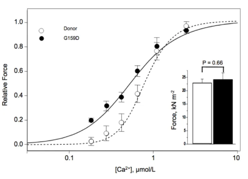 The shift to lower [Ca2+] and loss of cooperativity was accompanied by considerable loss of contraction strength, however this does bypass the cMyBP-C substrate control and the linkage is not floppy as with DCM mutations in light chain, see later.