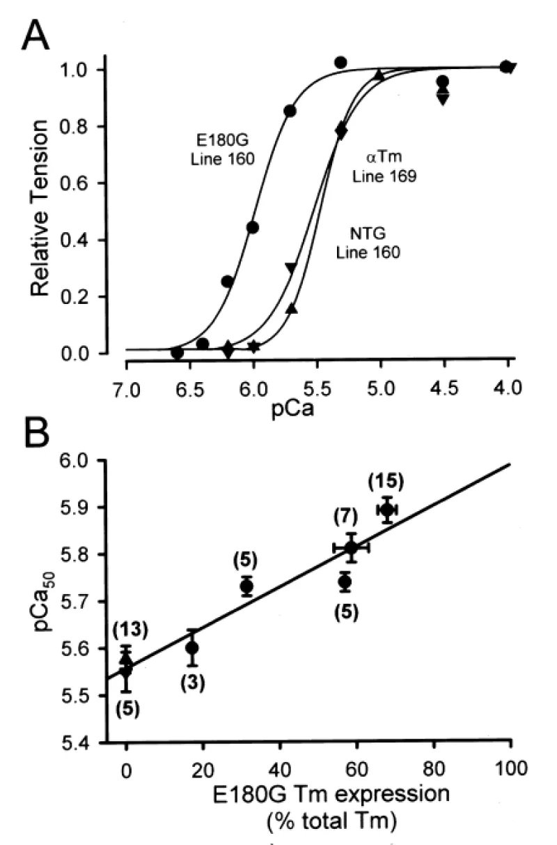 Figure 20: E180G ∝-Tm transgene dose dependence of increased Ca2+ sensitivity of force production in single cardiac myocytes. A, Ca2+-activated force generation in representative single cardiac myocytes isolated from NTG (▲), 169 WT ∝-Tm (▼), and 160 E180G ∝-Tm (●) mice. B, E180G ∝-Tm transgene dose dependence of increased Ca2+ sensitivity of force production, from Michele, et al. [37].