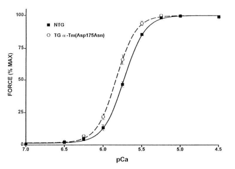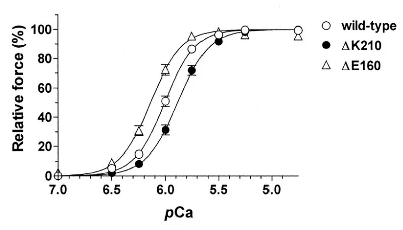 Figure 25: Force–pCa relationships in the rabbit skinned cardiac muscle fibers into which human wild-type, ΔK210 (DCM), or ΔE160 (HCM) cTnT was incorporated. Maximum force levels were both ca. 30% down compared with wild-type, from Morimoto, et al. [45].