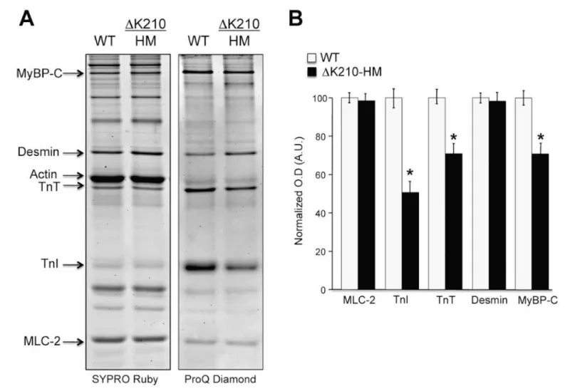 Figure 26: Differential phosphorylation of sarcomeric proteins in isolated myofibrils from ΔK210 homozygous hearts (DCM). A, cardiac myofibrillar proteins stained with ProQ Diamond for phospho-proteins detection and Sypro Ruby for total protein detection. They show equal protein content (Sypro) and disparity in phosphorylation levels (ProQ), from Sfichi-Duke, et al. [46].
