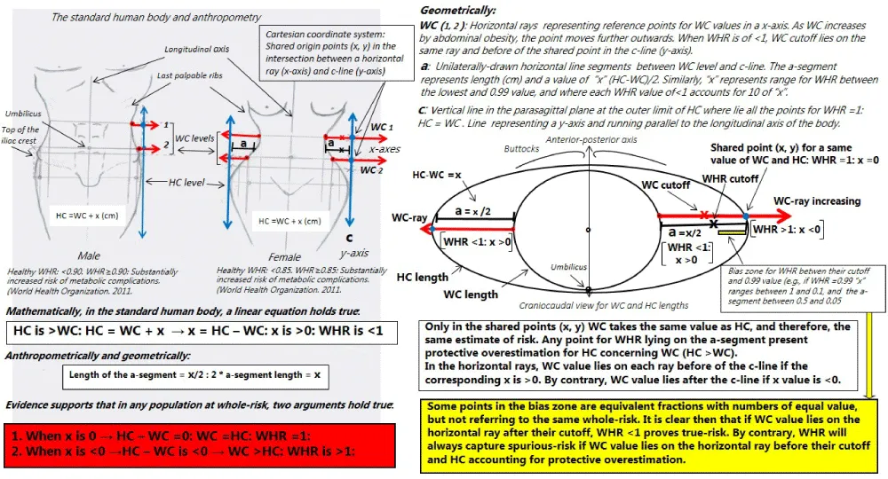 Surprisingly, most studies in predicting MI and mortality risk always showed a WHR cutoff < 1 in both sex, while selection biases were never discussed [3-6,10-12]. Indisputably, “x” was always a higher positive value in women and middle-aged than in men and elderly, respectively [2-5,10,12], and therefore, WHR cutoffs were always lower in the first two compared to the seconds. This means longer range up to 0.99 for involving higher possibility of bias in women and middle-aged due to a higher number of fractions where selection bias for WHR will always occurred [3-6,10-12]. In this line, WC and WHR would mathematically be equivalent for the same whole-risk, if and only if HC = WC, and therefore, WHR = 1 would be the entity of whole-risk exclusively depending on WC, and besides, HC taking the same value as HC. If not, error of estimate for the true-BC at risk may occur in comparing WC alone with WHR, and either by age or by sex. Therefore, if HC > WC (WHR risk cutoff < 1) protective overestimation occurs for HC respect to WC, and the lower the WHR cutoff (e.g. in women), the higher the risk overestimation for WHR as compared to WC. It is mathematically clear, in any anthropometric-risk evaluation where baseline characteristics for WHR and WHR risk cutoff are of < 1 WC alone turn out to be the entity of whole-risk to be compared, but never WHR performing better than WC, except accepting biased results.