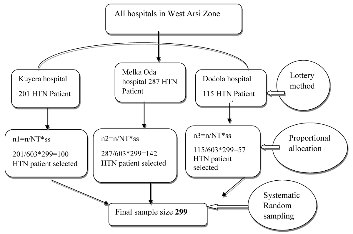 Sampling procedure: In the zone, there are 7 hospitals that offer chronic follow-up services. First, out of 7 public hospitals, three were selected by simple random sampling. Then, the sample size was allocated to three hospitals proportionally (based on the number of patients reporting per month). Study subjects were selected by using systematic random sampling method; every second hypertensive patient visiting the facilities at chronic follow-up departments who were known to be hypertensive (Figure 1).
