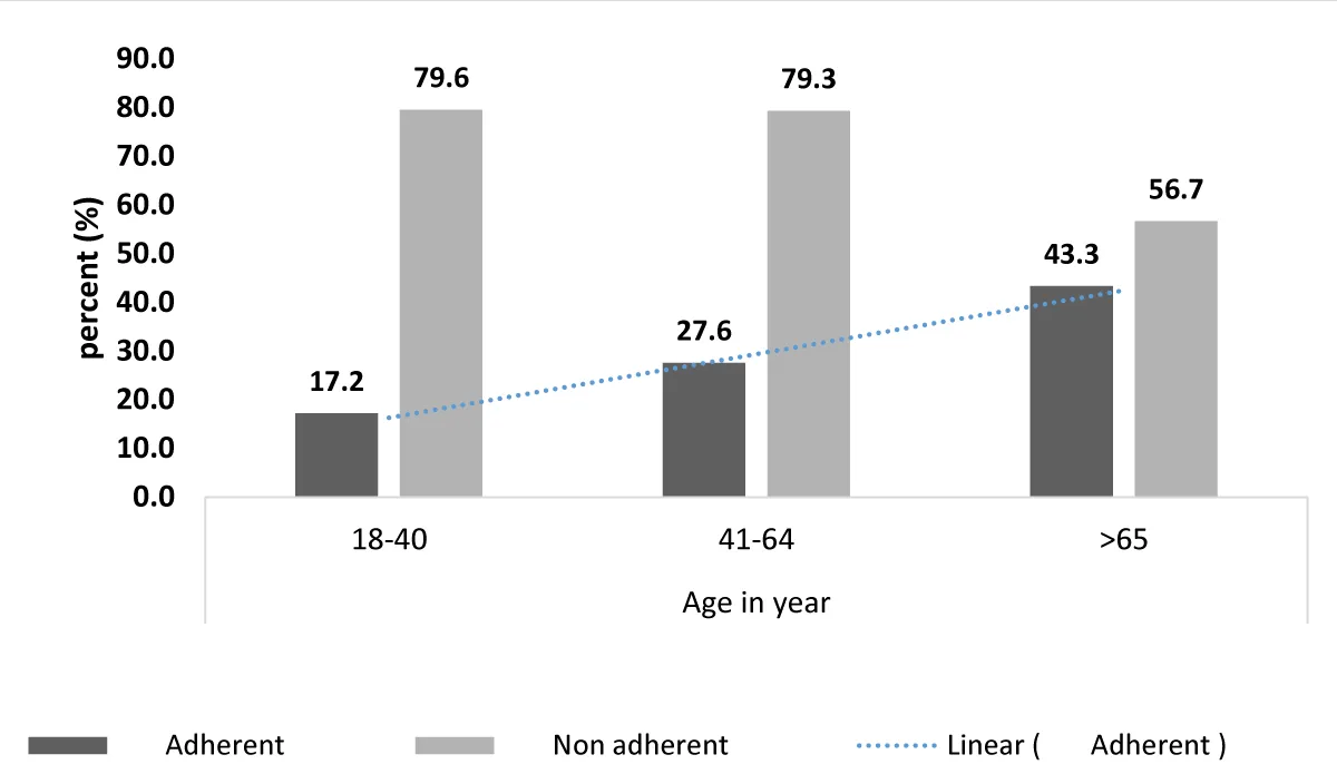 Figure 2: Adherence to healthy lifestyle by age group among hypertensive patients attending chronic follow up units of selected hospitals in West Arsi zone, Ethiopia, 2019.