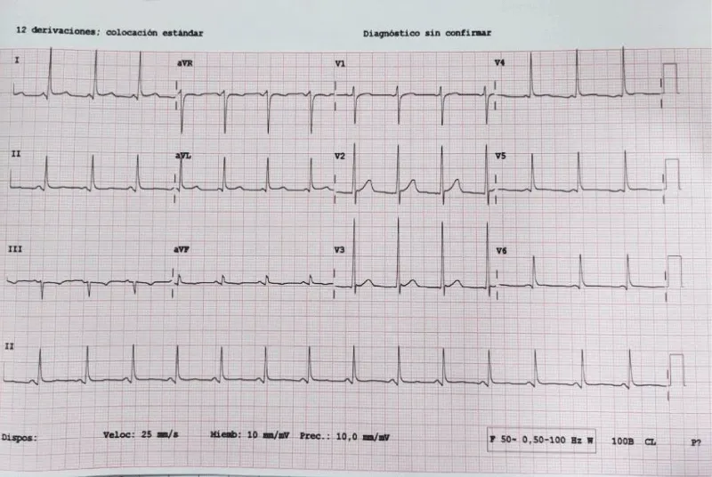 Figure 1: EKG on sinus rhythm, normal PR, narrow QRS, normal axis, with left ventricular hypertrophy signs.