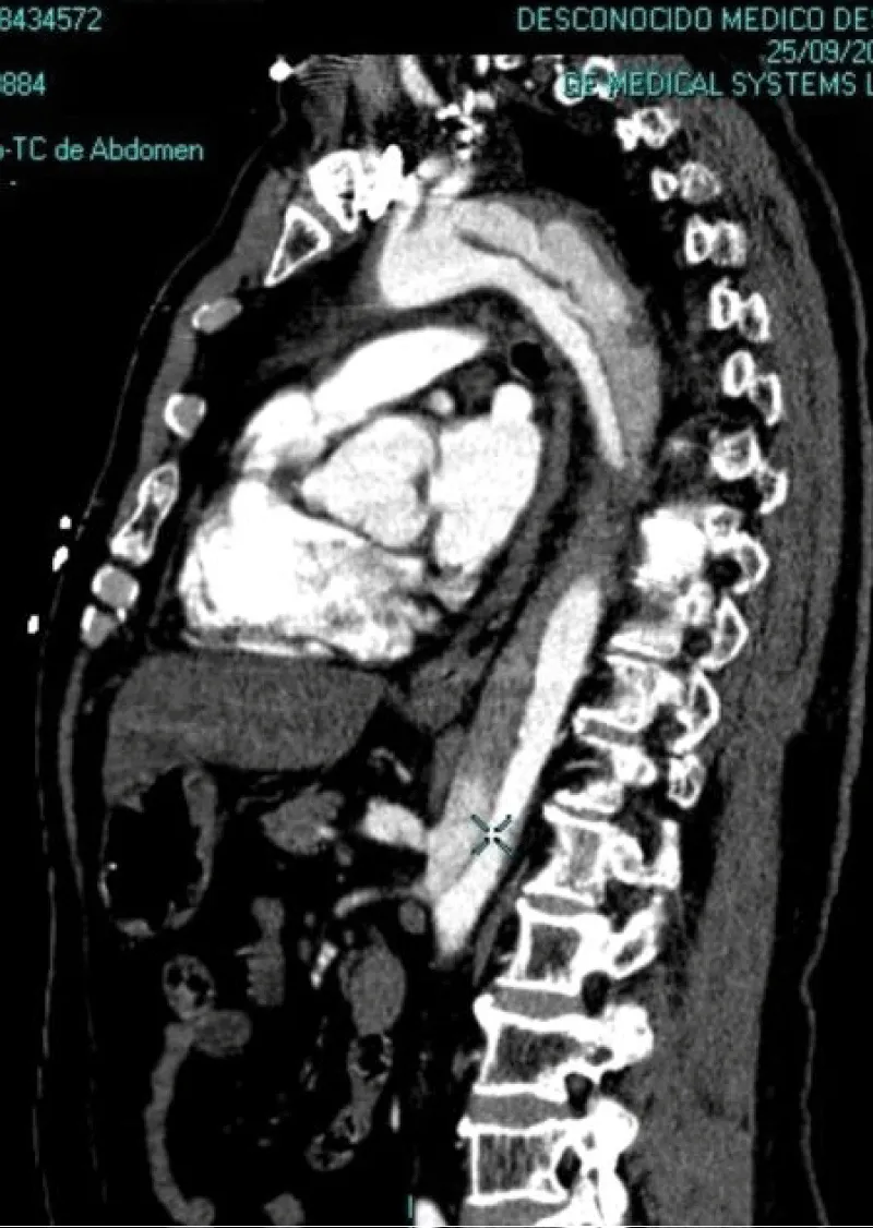 Figure 2: Lateral CT image where it can be an observed dissection of the aortic artery, with false lumen distal to left subclavian artery to the abdominal aorta without affecting the aortic arch (Stanford type B).