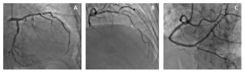 Figure 1: Angiographic finding (A: LAD stenosis in caudal view. B: LAD stenosis in cranial view. C: RCA).