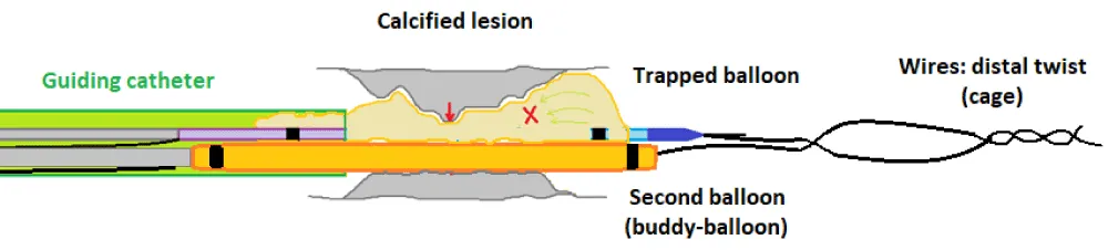 Our technique for this patient was to create, thanks to the second 0.014 guidewire twisted with the first, what we called a cage. Associated with a buddy-balloon, that has the dual purpose of modifying the plaque using the part of the balloon inflated in the lesion, but also to trap the stucked balloon in the guiding-catheter thanks to the part of the balloon inflated in the latter.