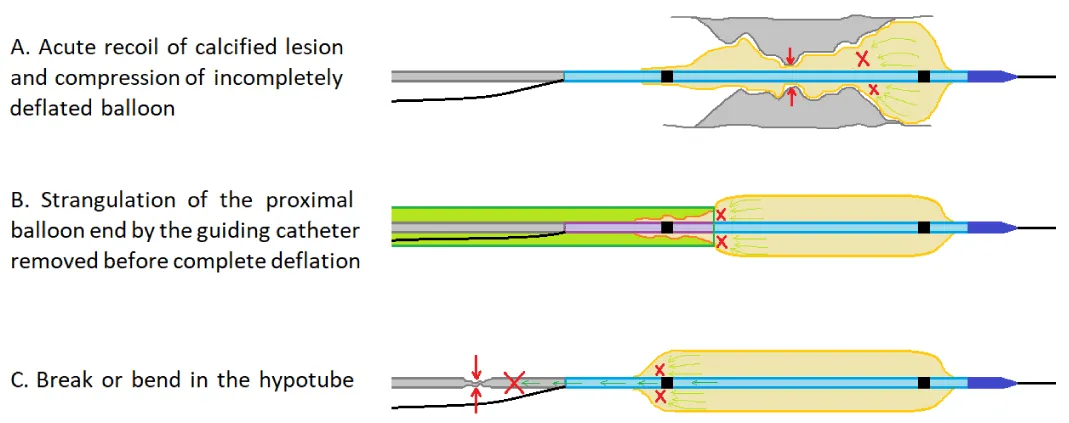 - Strangulation of the proximal balloon end by the guiding-catheter if the balloon is removed before complete deflation.