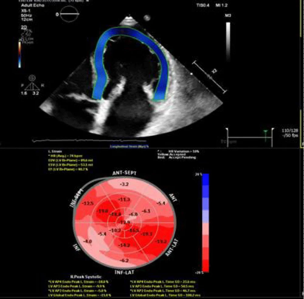 Figure 8: 2D speckle tracking of LV revealed GLS =-19.7%.