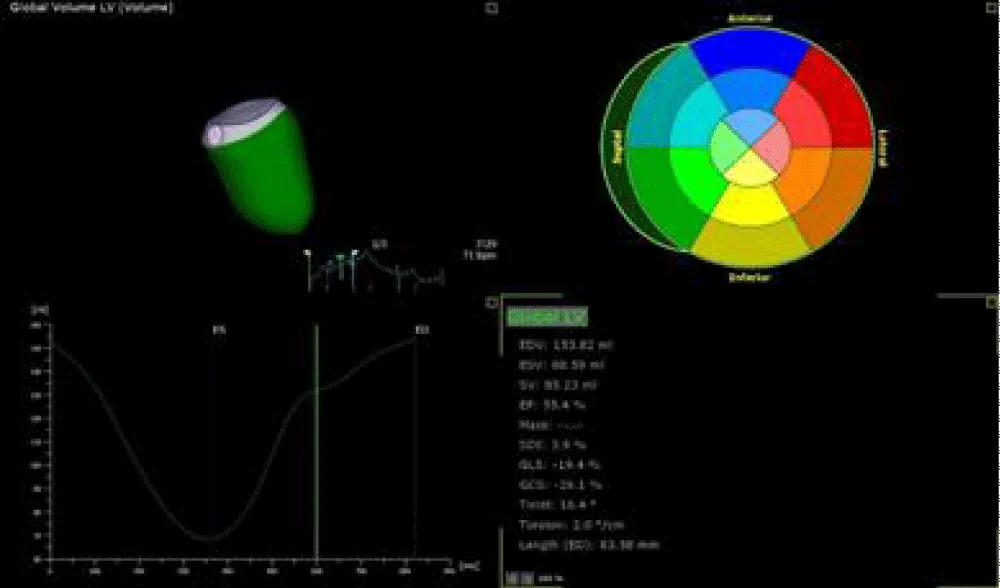 Figure 9: 3D TTE revealed average LV volumes with GLS =-17.2%.