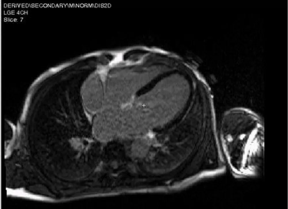Figure 4: CMR-LGE 4 chamber view revealed no fibrosis.