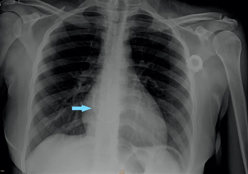 Figure 1: Chest radiography shows a fractured chest port catheter in the right atrium (blue arrow).