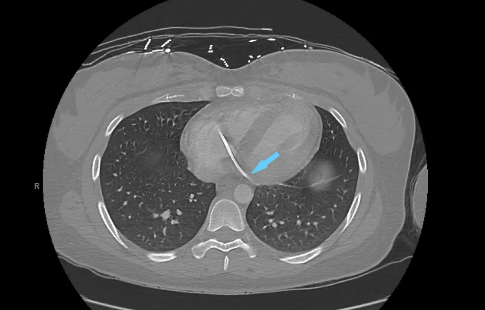 Figure 2: Computed tomography of the chest shows a fractured port in the coronary sinus of the right atrium (blue arrow).