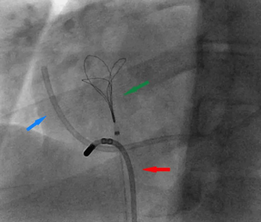 Figure 3: Right Heart catheterization shows a Navigational steerable catheter hooking the port and disengaging it from the coronary sinus. Fractured Port (blue arrow), Navigational steerable catheter (red arrow), Snare (green arrow).