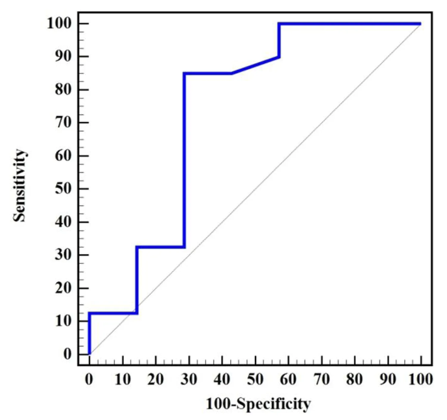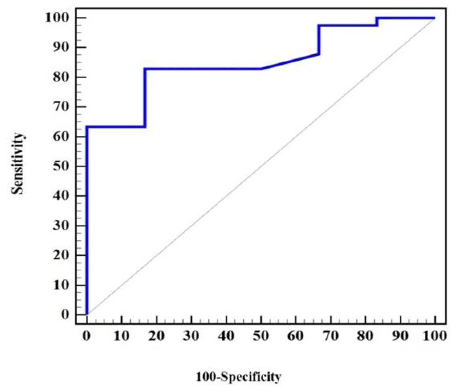 Figure 2: The RCO curve shows the sensitivity and specificity of the GLS to predict improvement in left ventricular end-systolic volume.