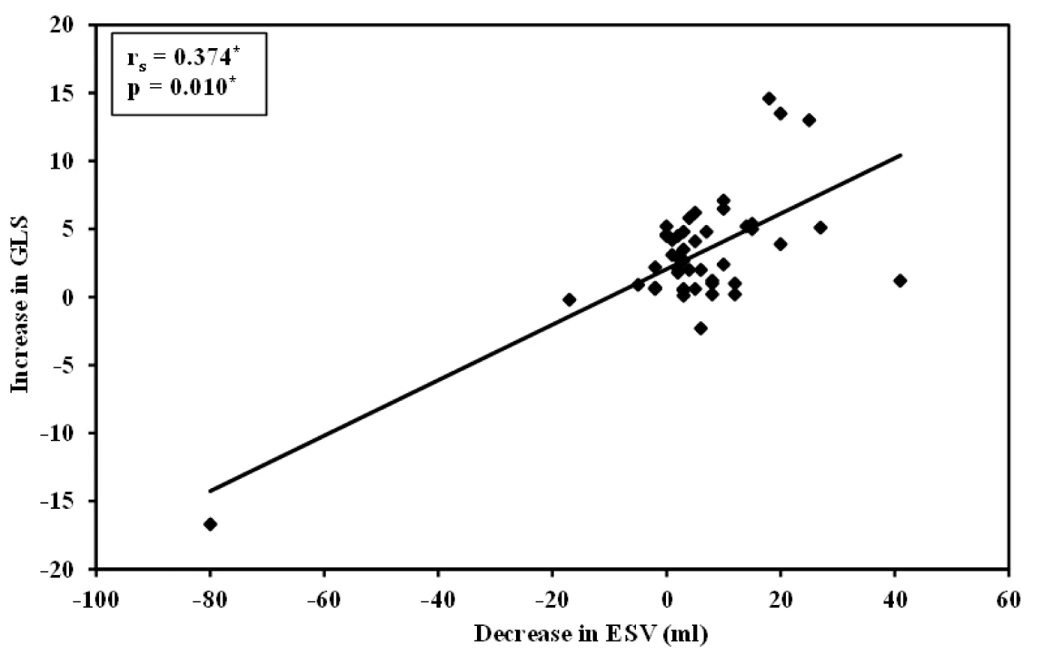 Figure 3: Shows a linearly significant correlation between the increases in GLS and the decrease in LVESV.