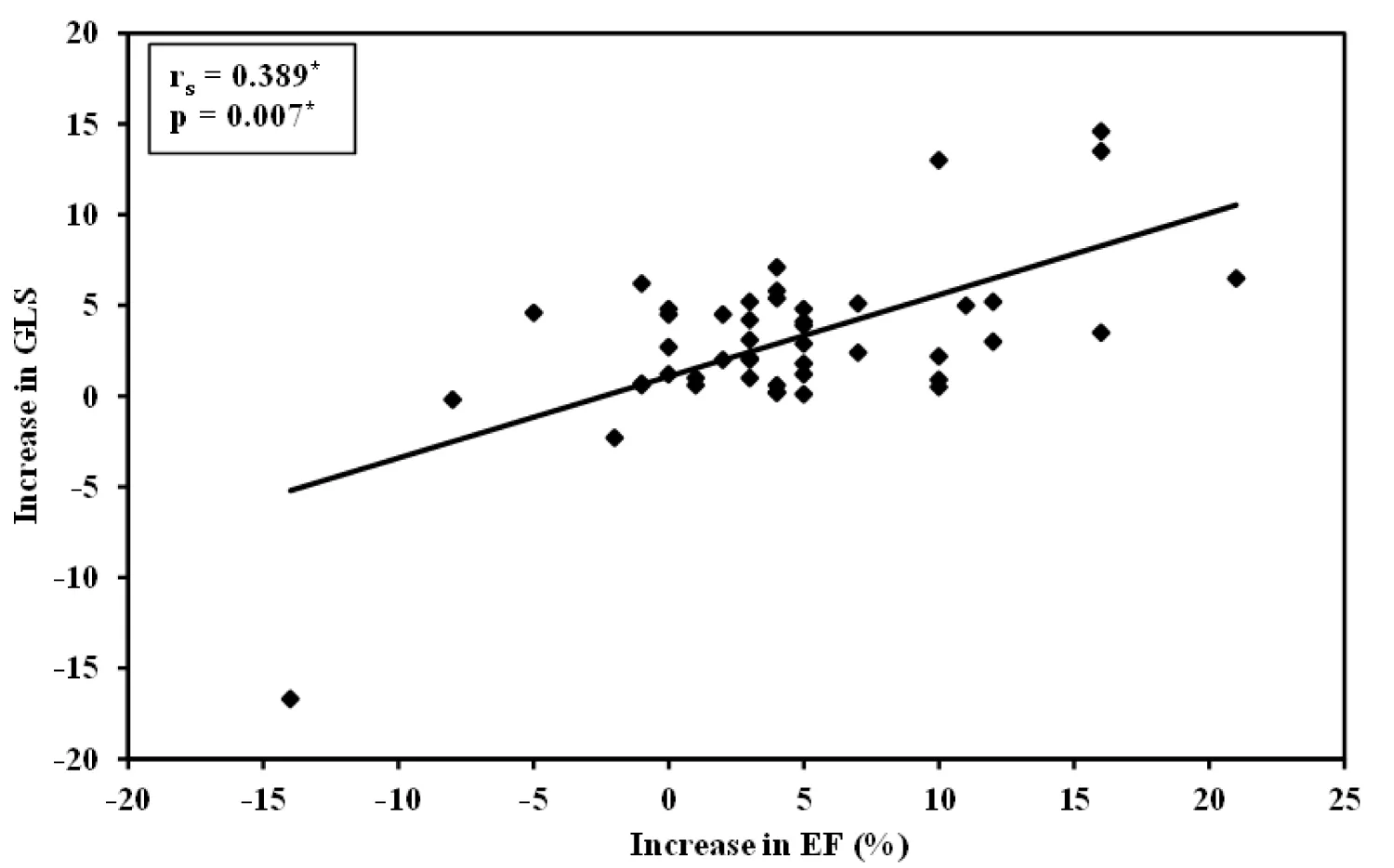 Figure 5: Shows a linearly significant correlation between the increases in GLS and the increase in LVEF.