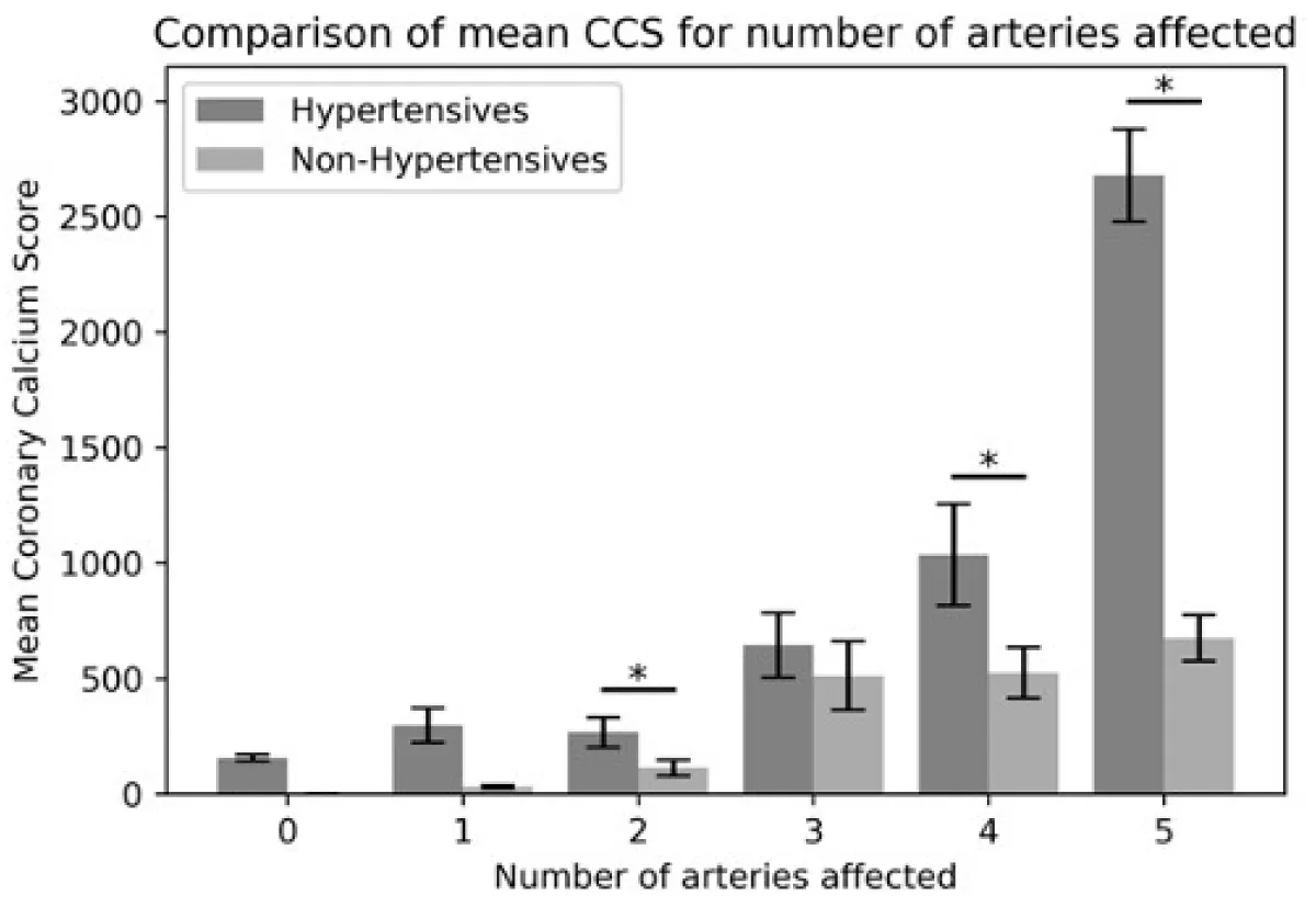 A higher number of affected coronary arteries correlated with a higher mean CCS and a significant difference in CCS was observed between hypertensives and non-hypertensives for the number of arteries affected (Table 6, Figure 5). Similar results were observed when comparing mean CCS in moderate-severely affected coronary arteries (Tables 6,7 Figure 6).